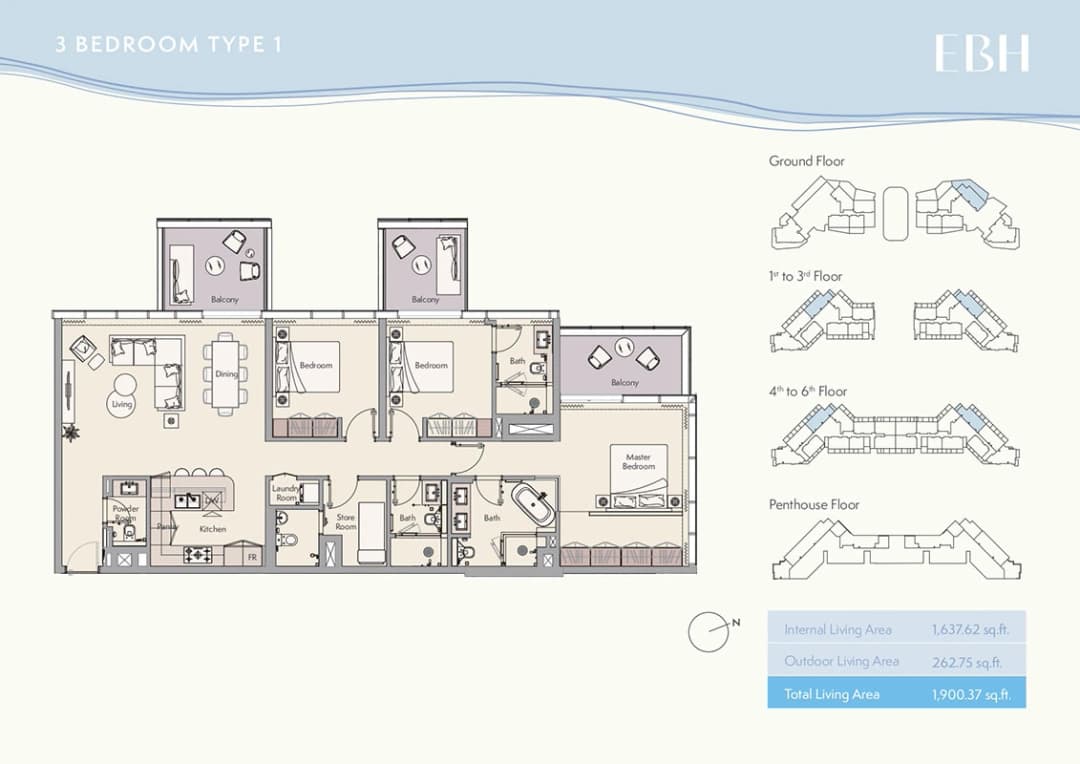 Ellington Beach House offers a range of thoughtfully designed layouts, including 1, 2, 3, and 4 bedroom apartments, along with exclusive penthouses. Each residence features open-plan living areas, spacious balconies, and floor-to-ceiling windows that maximize natural light and sea views.